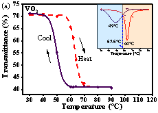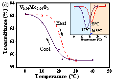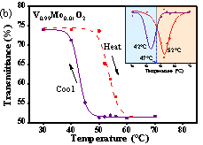 低温相变VO2功能薄膜的制备和相变机理研究。采用溶胶凝胶法制备了不同Mo、Nb掺杂量的VO2薄膜,并对其进行了气氛退火处理。XRD和Raman光谱表明,杂质原子已成功地融入到VO2晶格中。同时,由于取代V4+引起晶格畸变,VO2薄膜的粒径减小。并且XPS光谱显示了掺杂可能诱导V4+转化为V3+,从而影响太阳能调制效率。参杂后VO2薄膜表现出优异的Tvis(73.9%)和ΔTsol(6.4%)。掺杂可以调节VO2薄膜的相变温度,Tc随Mo浓度变化达到-9.7k/at%。同时掺杂可以调节热滞回线的宽度。