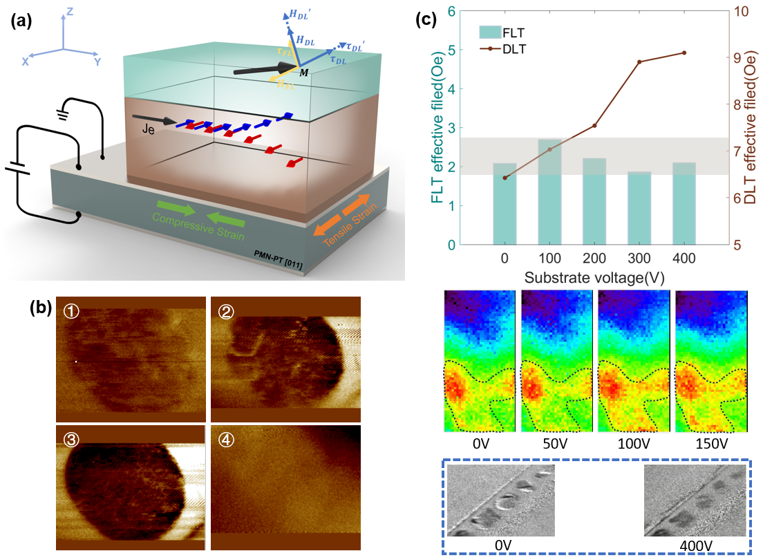 Hong Jeongmin教授团队以“An energy efficient way for quantitative magnetization switching”为标题发表的论文重点探索了电控自旋器件铁电 (FE) 和铁磁 (FM) 材料中电控磁化开关特性,并在高能效自旋存储器和逻辑器件中开展了应用研究。文中研究了压电衬底上的自旋轨道转矩效应的角度依赖性,利用基底上的电场控制局部面内应变,实现受控应变通过多铁氧体异质结构中的 SOT效应对磁化切换进行定量调制。通过谐波霍尔测量、XMCD-PEEM、XRD、VSM、MFM和微磁仿真模拟,来揭示电场对磁化开关行为的可控性。