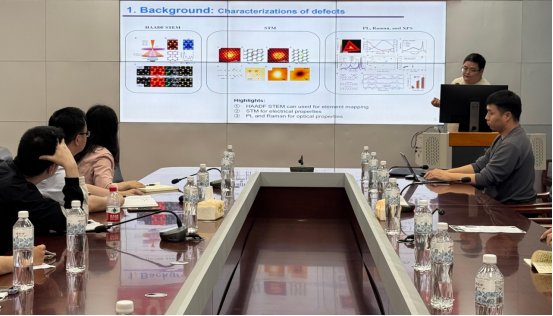 在此次学术报告中,刘教授详细阐述了三位一体的研究方法,并分享了围绕光电催化材料取得的一系列创新性成果:团队设计出含sp杂化的非线性二维结构,经反复实验,首次成功合成大孔石墨单炔,为材料科学的进一步发展开辟了新路径。吴教授介绍了二维半导体点缺陷形成及对材料性质的影响,对比谱学测量法和直接成像法这两类点缺陷表征技术。同时研究固态重凝硫法和碘辅助法制备低缺陷二维半导体的生长机理。最后,探讨二维半导体在缺陷识别和抑制领域的机遇、挑战,并展望未来方向。此次报告为相关研究提供了新思路,助力先进二维材料在高性能电子器件领域应用。报告会上,学院师生和两位教授进行了热烈的交流,大家广受启发,收益颇丰。