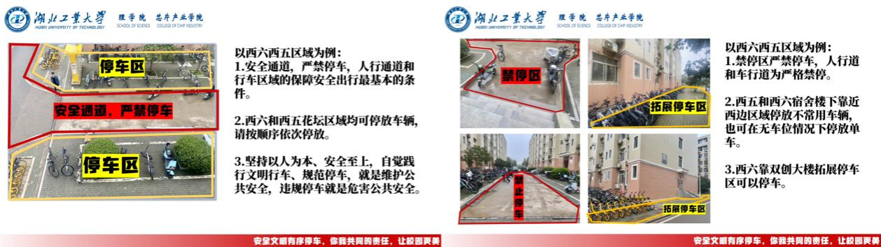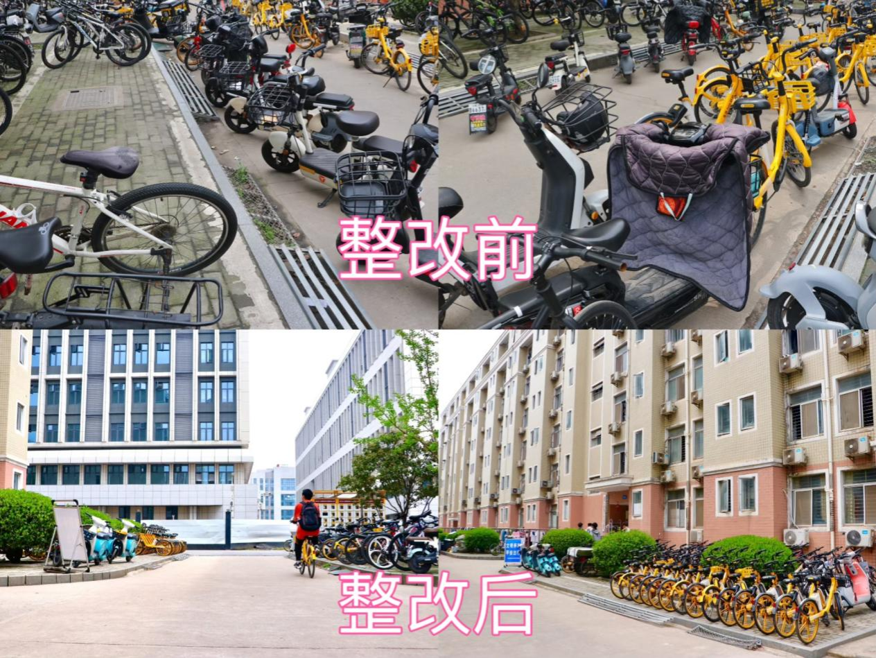 针对学生社区情况,学院对西六的可使用的停车区域进行系统规划、科学划划分,解决学生停车难、停车秩序乱等实际问题。将马路到进宿舍楼一段划定为常用停车区,方便学生停放和使用车辆。将靠近西区篮球场一侧区域,划定为拓展停车区,引导学生将不常用车辆放在拓展停车区。同时针对车辆多、停车位置少的问题,拓展宿舍楼栋附近的部分区域为共享单车停车区,联系运营公司将共享单车在此区域摆放,进一步拓展了停车的范围。