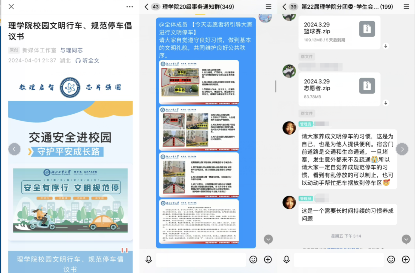3月28日,理学院学生会向师生线上发布校园文明行车、规范停车倡议书,号召师生积极参与文明停车,提高安全消防意识,以主人翁的精神共同营造文明、安全、畅通、有序的道路交通环境,做文明交通的践行者、宣传者和监督者。同时,学院通过各年级、学生会、网格员等qq群,向同学们滚动式推送安全文明行车停车的相关警示案例、倡议号召、整改措施、科普消防安全等相关通知20余条。