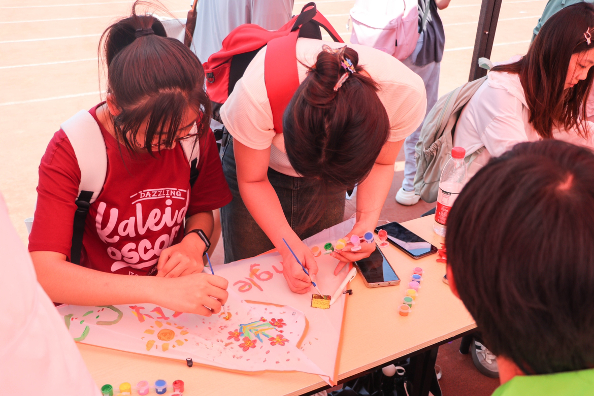 清风托纸鸢,扶摇飞满天。“趣绘纸鸢”活动同样引来许多同学的参与,他们在空白的风筝上绘制图案,有的画出了自己喜爱的动漫人物,有的画出了蓝天白云,有的画出了自己的理想与愿景。同学们互相交流绘制想法和创意,在操场上放飞风筝,放松心情。