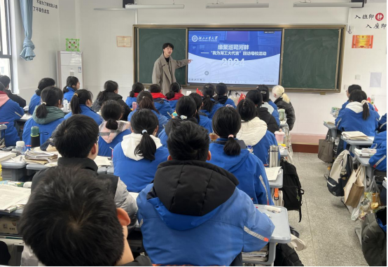 辅导员老师和大学生代表深入高三班级,通过生动的讲述和精彩的展示,介绍湖工大的建筑、风景、专业、就业、校园文化活动等各个方面,进一步加深中学师生对湖工大的认识与了解,激发他们的报考热情,同时也为高中生们分发了湖工大文创礼品。问答环节更是将现场气氛推向高潮,高中生们积极提问,对学校的专业设置、校园生活、课程学习等方面进行了深入了解。