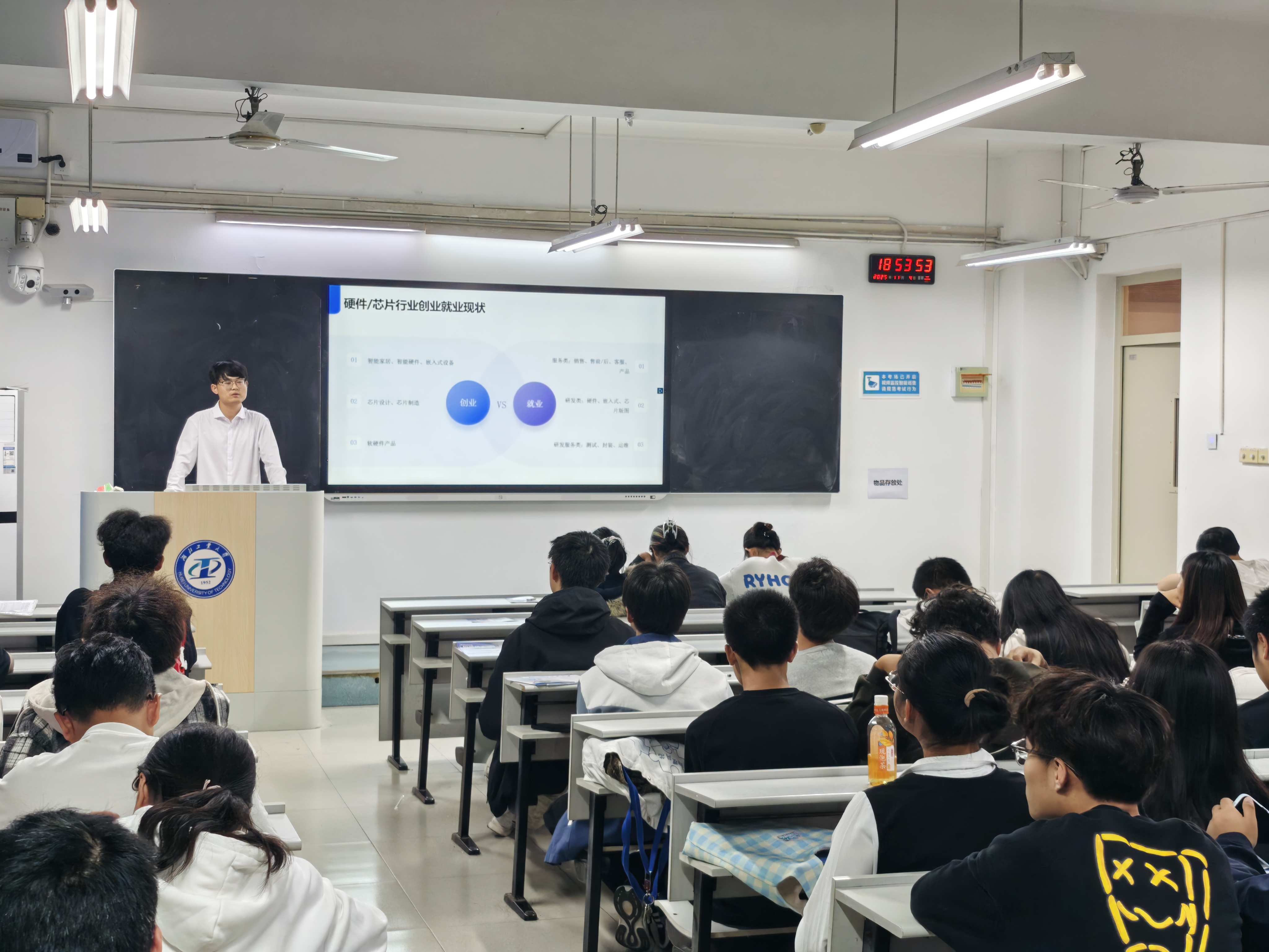 11月4日,朱硕在二教307教室为电子科学与技术专业学生带来首场宣讲。他以电子科学与技术专业背景为切入点,系统阐述低代码开发平台的技术架构与商业化路径,通过展示天码CE平台在AI产品研发、物联网嵌入式开发等领域的53项落地案例,深入分析技术创业中知识产权布局、股权设计策略及政策资源整合方法,并分享自身从校园项目到高新技术企业的成长历程与管理心得。
