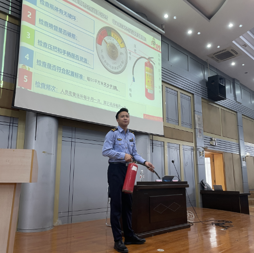 会议第一阶段,进安消防中心李进教官作题为“预防为主,生命至上”的主题培训。他结合现实案例,综合运用图片、视频、现场演示等方式围绕火灾的特点、预防火灾的基本常识、如何有效排查安全隐患,日常用电用气用火安全,不同类型、不同阶段火情处置方式等进行了讲解,并结合学校教学楼人员密集的特点,就如何组织人员疏散、自救逃生、正确使用灭火器材的方法以及火灾现场自救逃生的技能等知识进行了详细介绍,引导广大教职工摒弃侥幸心理,牢固树立消防安全的意识,对安全隐患做到早发现、早处理,处处留心、时刻警惕。