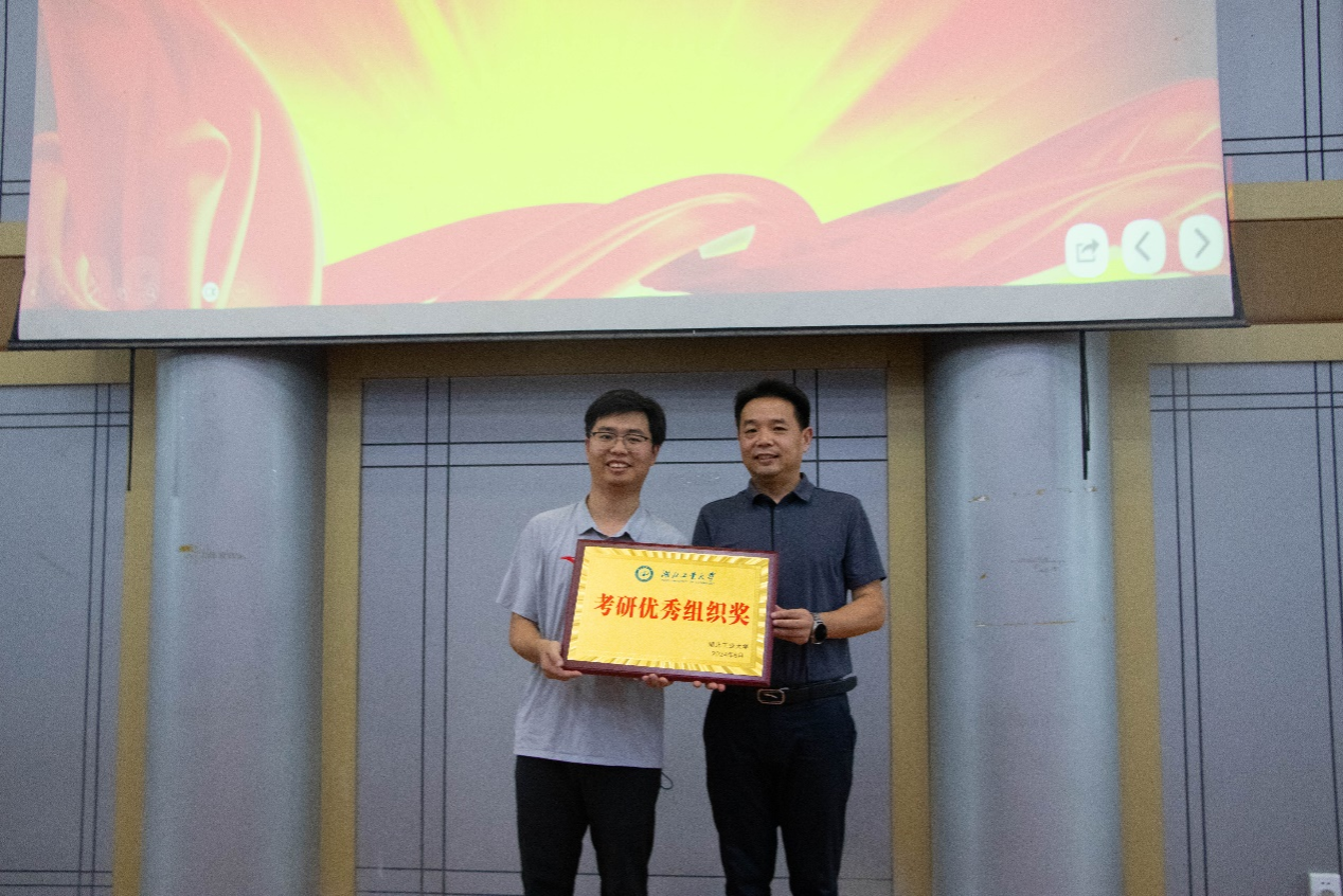 在颁奖环节,企业代表戴艳为7名同学颁发学院考研特别奖,吕辉为所带班级整体深造率达33.5%以上的5位班导师颁发了学院考研优秀班导师荣誉证书。张承涛为获得学校考研精英奖、考研特别奖、考研优秀寝室的学生代表颁发了荣誉证书。