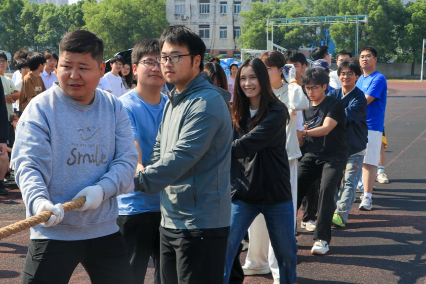 师生友谊拔河赛,双方选派选手出战,队员们紧握麻绳、蹬地蓄力,拉拉队在一旁加油呐喊助威,麻绳在胜负线间胶着,每一次拉扯都扣人心弦,尽显两院师生的顽强拼搏斗志与众志成城的团队凝聚力,将现场气氛推向高潮。