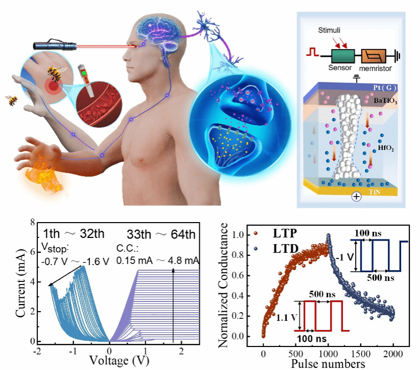 Jeongmin Hong教授团队在这项工作中展示了一种基于Pt/BaTiO₃(BTO)/HfO₂/TiN结构的超高灵敏度跨模态伤害感知系统。该器件能够检测并处理触觉和视觉刺激中的微小变化。其优异性能主要归功于在HfO₂功能层内引入了BTO中间层。BTO层中丰富的氧空位能够精确控制BTO/HfO₂忆阻器中导电丝的形成和断裂,从而使器件表现出具有超高灵敏度的伤害感受器特性。它展示了阈值响应、无适应性、弛豫和增敏等关键特征,即使刺激有轻微增加也能触发显著的响应。此外,将BTO/HfO₂传感器集成到一个跨模态系统中还能够模拟视觉、触觉和痛觉感知,凸显了其在先进人机交互应用中的潜力。