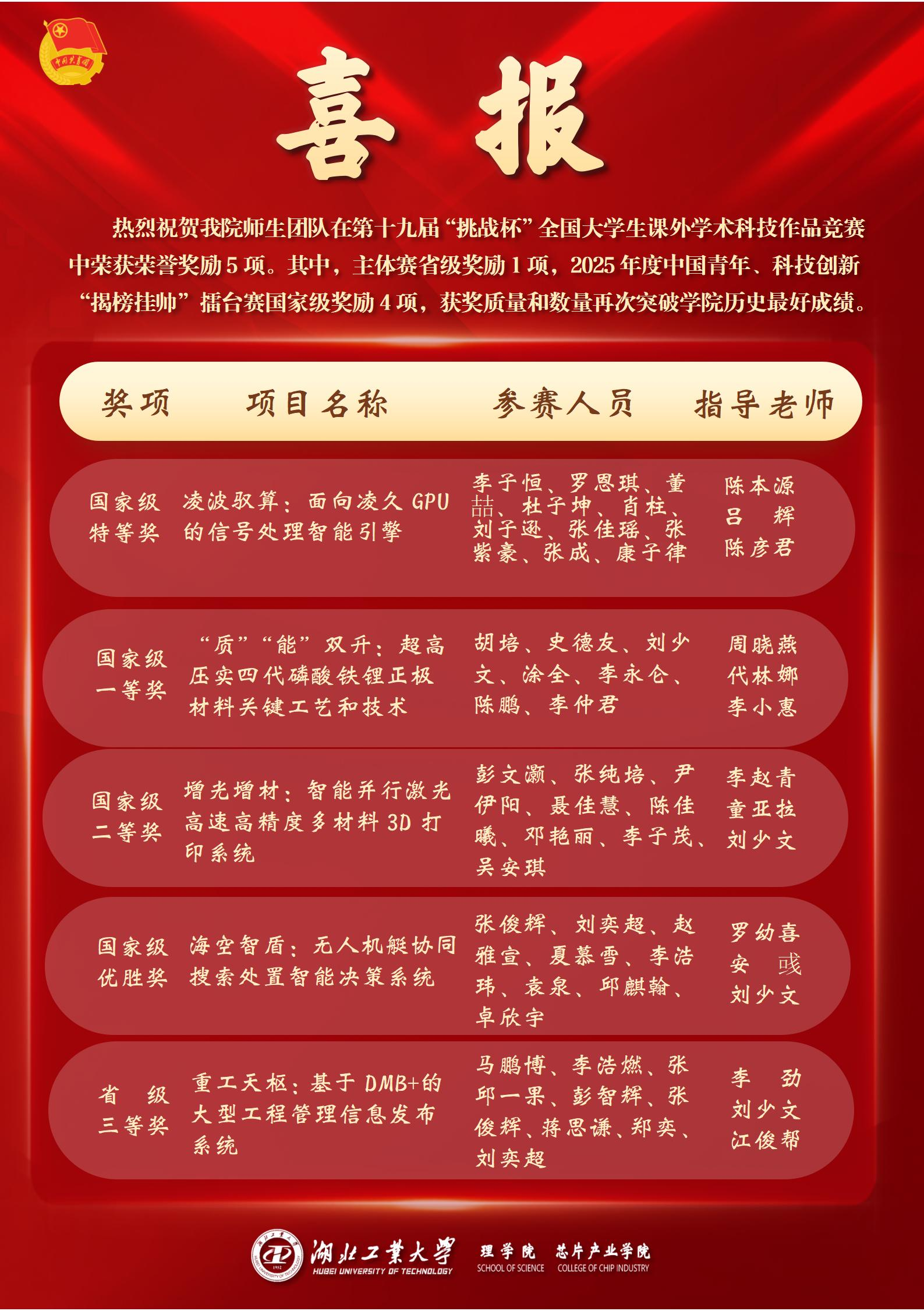 2025年,学院师生团队在第十九届“挑战杯”全国大学生课外学术科技作品竞赛中斩获荣誉奖励5项。其中,主体赛省级奖励1项;2025年度中国青年科技创新“揭榜挂帅”擂台赛4个培育项目,全部入围国赛现场决赛,荣获全国特等奖1项、一等奖1项,二等奖1项、优胜奖1项,获奖质量和数量再次突破,创造学院在该项赛事的历史最好成绩。