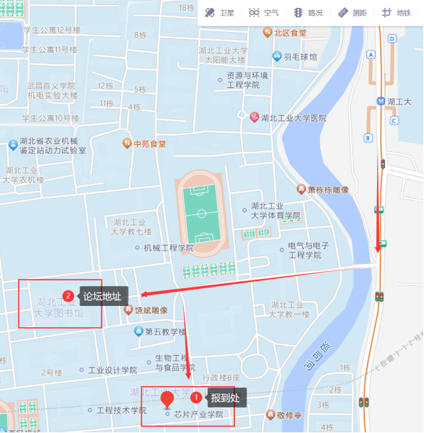 导航前往湖北工业大学实训楼,从湖北工业大学学校正大门(东门)进入校区。